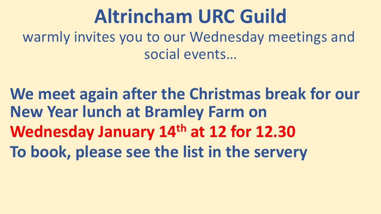 The Guild opened its programme for the 2025-2026 Season with their first meeting on Wednesday September 17th with Tea & Chat and (shhhhh)…….payment of Guild Subscriptions for the new Guild Year. The new syllabus was also available. The Guild welcomes all members and friends of Altrincham URC and extends a warm ‘Hello’ to all.