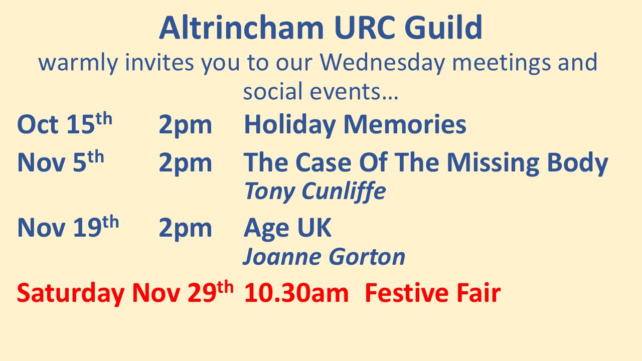 The Guild opened its programme for the 2025-2026 Season with their first meeting on Wednesday September 17th with Tea & Chat and (shhhhh)…….payment of Guild Subscriptions for the new Guild Year. The new syllabus was also available. The Guild welcomes all members and friends of Altrincham URC and extends a warm ‘Hello’ to all.