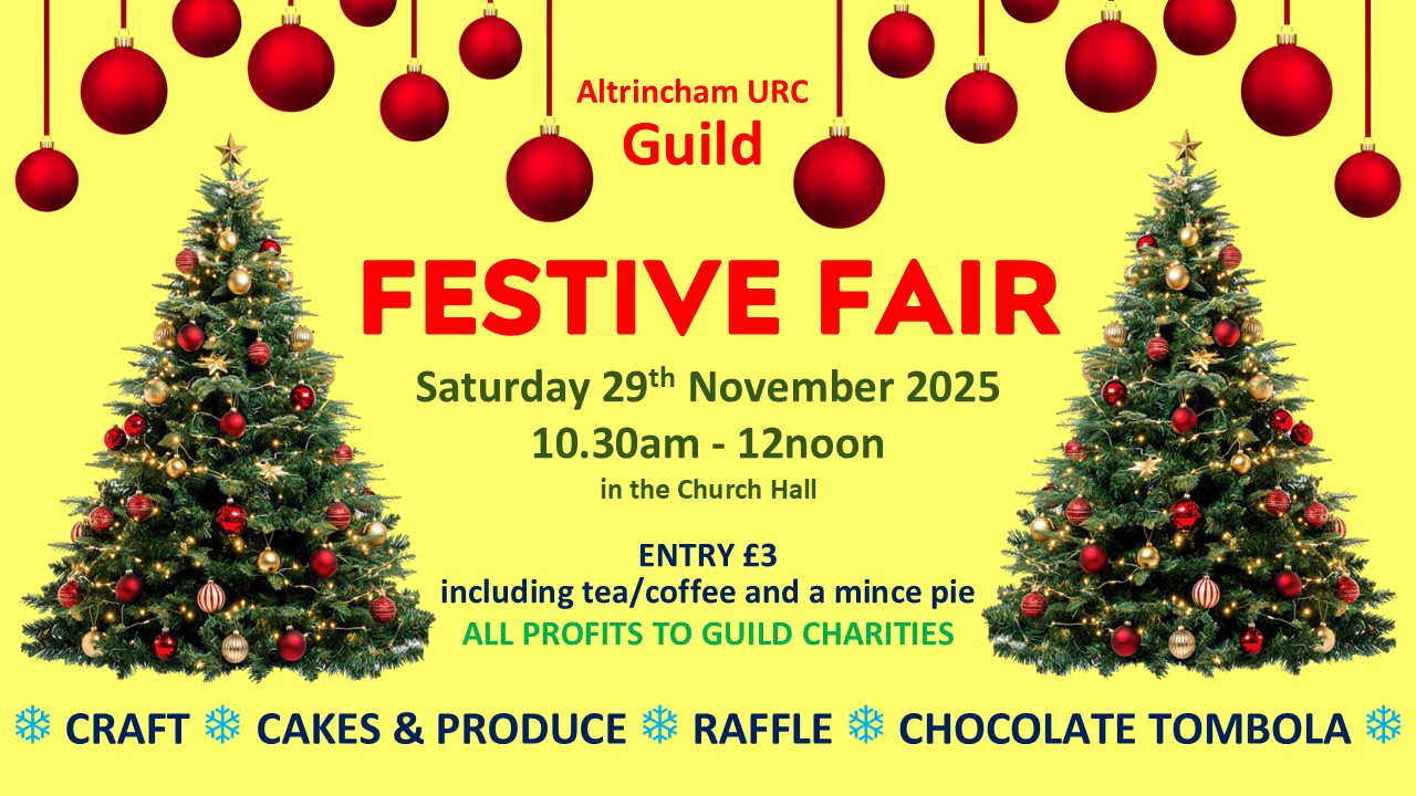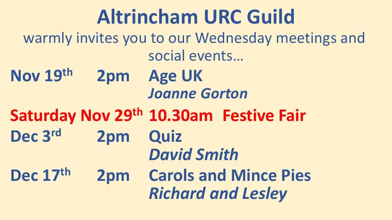 The Guild opened its programme for the 2025-2026 Season with their first meeting on Wednesday September 17th with Tea & Chat and (shhhhh)…….payment of Guild Subscriptions for the new Guild Year. The new syllabus was also available. The Guild welcomes all members and friends of Altrincham URC and extends a warm ‘Hello’ to all.